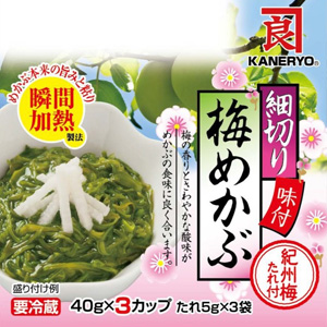 紀州梅を使用した爽やかな梅タレが付いた細切りのめかぶ。